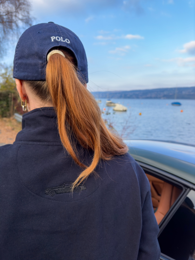 Clean lines, quiet craftsmanship. This quarter-zip pullover presents the Maison Pauvre “M | P” logo on the chest and a subtle navy Rolls Royce Phantom coupé embroidered quietly on the back. An elegant nod to speed and understatement, built for effortless transitions and thoughtful detail.